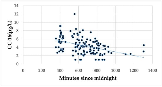 The association between the serum concentrations of club cell protein 16 (CC-16) at baseline and time of blood sampling in minutes after midnight among all participants. The following regression equation was calculated: CC-16 = 7.3 (6.2 to 8.5) −0.004 (−0.006 to −0.003) minutes since midnight. The 95% confidence intervals are shown in brackets. Pearson’s r = −0.41; p < 0.001.