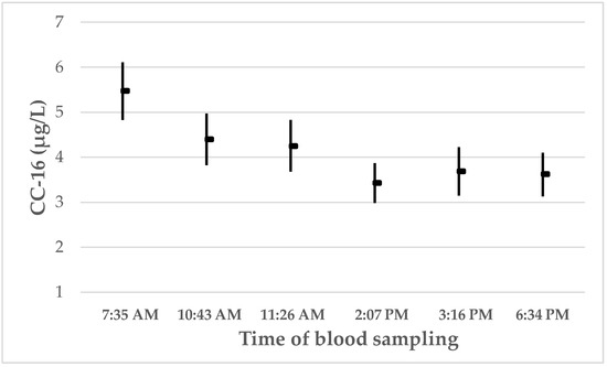 The difference in serum CC-16 concentrations between the highest and lowest concentrations during the day is substantial. It is therefore important that studies of serum CC-16 concentrations are carefully designed to take these variations into account. Studies where blood is collected before noon may be particularly vulnerable to the variation during the day, because the steepest decline in the concentrations appears to occur in the morning.