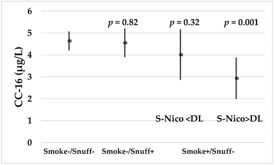 The concentrations of CC-16 at baseline were not statistically significantly associated with S-Nico and S-Cot, respectively. However, when stratifying the participants according to current smoking and snuffing habits, it appears that those smokers with S-Nico > DL who were not snuffers had significantly lower CC-16 concentrations than both non-smokers/non-snuffers and snuffers. Smokers with S-Nico < DL who were not snuffers had serum CC-16 concentrations comparable to the concentrations of the non-smokers/non-snuffers and snuffers (Figure 3). The GM (and 95% CI) S-Cot concentrations were statistically significantly (p < 0.001) lower among smokers with S-Nico < DL (21; 11–40) than among smokers with S-Nico > DL (269; 163–444).