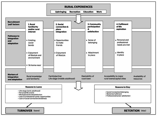 Research focused on the recruitment and retention of the rural health workforce in advanced economies identified the decisions of health professionals to stay or leave rural practice to be informed by a range of issues including job satisfaction, professional development, and career advancement opportunities, which intersect in unique ways [20,21]. Some health workforce studies investigating recruitment and retention categorize impacting issues into “push” (to leave the job) or “pull” (to take a job or stay in the job) factors [22,23]. To date, the majority of rural health recruitment and retention research focused on recruitment influences and the medical workforce. From this body of research, there is strong evidence that rural background, extended rural placements, and cultural immersion all positively influence the rural practice intentions of medical graduates [24,25]. However, given the different educational pathways and incentives offered to attract and retain medical practitioners to work rurally in comparison to those for allied health and nursing, the transferability or relevance of these findings beyond the medical field is questionable. The more limited body of nursing and allied health workforce rural retention research mostly focused on single professions and job satisfaction and/or professional and career development opportunities. The social dimensions of retention are often ignored altogether or identified with little explanation or exploration of how they operate and influence retention. However, there is an emerging body of research identifying and investigating the influences of place-based social processes on rural allied health and nursing workforce retention [26,27,28]. By the term “social processes”, the authors are referring to human practices and actions involving interactions that are essential to the formation of social relationships [29,30,31]. From the perspectives of the authors, social interactions are influenced by and influence the specific contexts or “places” in which they occur [32,33,34,35]. An emerging body of research holds great potential for progressing the field of rural workforce retention more broadly because place-based social processes impact upon the individual regardless of specific profession.