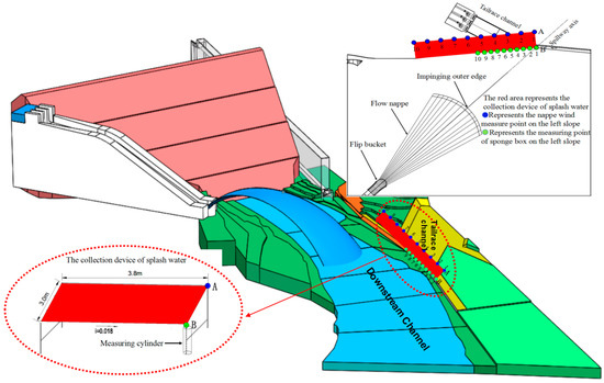 The flood discharge was measured by a rectangular weir. Through the dragging force between the trajectory nappe and the surrounding air, the surrounding air generates nappe wind by obtaining additional momentum from the high-speed flow nappe. The nappe wind was measured by the ultrasonic wind sensor (maximal measuring range: 0~10 m/s; measuring accuracy: 0.01 m/s; equipped with acquisition system; each point measuring 400 s, acquisition frequency: 1 Hz). The droplet diameter and splashing velocity were measured by the laser raindrop spectrograph (diameter measurement range: 0.125–8.5 mm; velocity measurement range: 0.2–20 m/s; intensity measurement range: 0.005–250 mm/h) which can collect and classify a large number of the characteristics of droplet parameters based on the droplet diameter. The flow velocity was measured by the propeller’s current meter which has a measuring accuracy of 0.01 m/s. We designed a splash collecting device and arranged it on the left side slope; the size of the device is shown in Figure 1. The sponge collection boxes with lengths of 20 cm and widths of 10 cm were numbered and arranged at the bottom of the left slope near the powerhouse tailrace; number 1 was located at point B and the interval of the measuring point was 20 cm. The atomization condition of each bucket type was compared by measuring the weight of the splash per unit time (the maximum range of the electronic scale is 4 kg, and the accuracy is 0.1 g). Starting from the downstream far boundary of the splashing area, the sponge boxes were placed point by point from far to near, and the number and initial time of each test box was recorded at the same time. After a period of time, the collection boxes were collected from strong to weak splashing intensity one by one. Riverbed scouring and silting were measured by a leveling instrument, and the digital camera was used to record the scouring of the terrain. The similarity method of the scouring velocity is often used to simulate the scour of rock foundation; according to the local rock geology, the scouring velocity of rock foundation is determined. Based on the scouring velocity data supported by the Geological Survey Institute, we used the Isbash formula [32] (, v represents the scouring velocity (m/s); D represents the sediment grain size (m), K represents the lithology coefficient and its range is from 5 to 7) to calculate the diameter range of the prototype, and then we obtained the diameter range of the physical model.