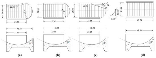 Flip bucket types of the physical model test: (a) shape 1; (b) shape 2; (c) shape 3; (d) shape 4; (units: cm).