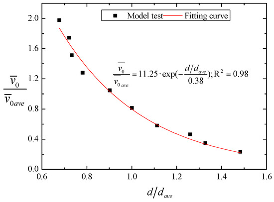 In previous research, the velocity and diameter of water droplets were taken as independent variables [13,14,20,21,22]. However, we found that there is a certain correlation between the splashing droplet diameter and its velocity in the experiment. As a droplet’s diameter increases, the ejection requires a larger initial impulse. So, for droplets with large diameters, the splash velocity and splash area are relatively small, and the relationship between velocity and diameter has a great influence on simulating the rainfall intensity distribution. Therefore, we used a laser raindrop spectrograph to obtain the dimensionless relationship between the droplet diameter and splashing velocity, as shown in Figure 3. Through data fitting, the dimensionless empirical equation can be expressed as the following: