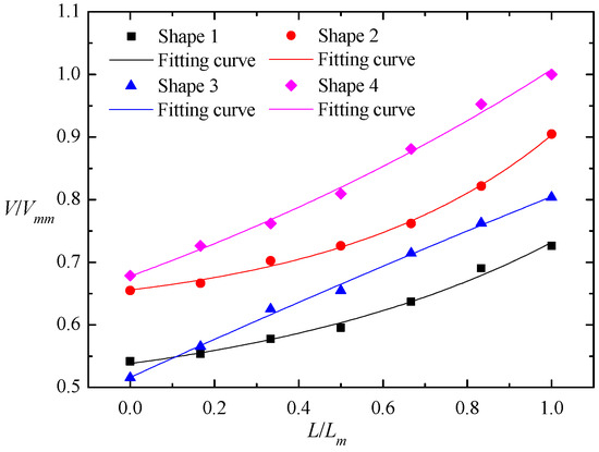 Nappe wind distribution in the longitudinal direction in the physical model test. Vmm is the maximum velocity among four shapes.