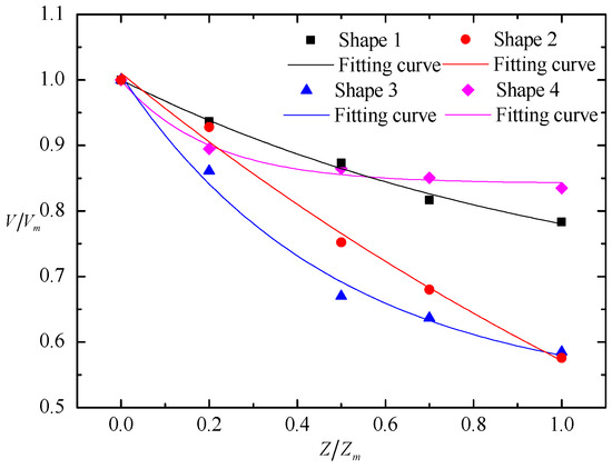 The dimensionless relationship between the nappe wind and the longitudinal distance is shown in Figure 4, We defined point B, which is the intersection of the spillway axis and power station tailrace, as the starting point, which is shown in the Figure 1. The results prove that the nappe wind tends to attenuate with a decrease in the distance to point B. In the spillway axial direction, the nappe wind of shape 1 is smaller than that of the other shapes. The main reason for this is that the nappe wind is attenuated by the action of viscous forces and frictional forces, as the bucket angle of shape 1 is bigger than that of the others, which causes the jet trajectory length to be shorter than that of the others, and the distance between the measuring point and the impinging position of the jet as well as the effecting time of the viscous forces and frictional forces are longer than those of the others. Therefore, the nappe wind of shape 1 is the smallest among the four types. In addition, due to being affected by the shape of the bucket, the attenuation degree of nappe wind is different for each bucket type. Shape 1 and shape 2 are tongue-shaped buckets, and their nappe wind attenuates slowly along the axis. Shape 3 and shape 4 are a curved surface bucket and a continuous bucket, respectively. The attenuation degree of nappe wind in the axis direction is larger than that of tongue-shaped bucket. At point B, Figure 5 is the dimensionless relationship between the nappe wind and the vertical distance. We can see that in the vertical direction, the nappe wind attenuation degree of shape 3 in the axis direction is larger than that of the other buckets.