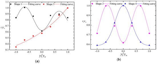 Nappe wind distribution in the lateral direction in the physical model test: (a) shape 1 and shape 3; (b) shape 2 and shape 4.