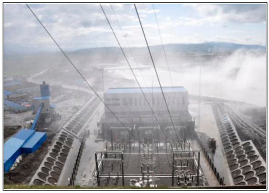 The rainfall area of flood discharge atomization is divided into three levels [14]: the torrential rainstorm area (the rainfall intensity is more than 50 mm/h), the rainstorm area (the rainfall intensity ranges from 10 to 50 mm/h), the drizzling rain area (the rainfall intensity ranges from 0.5 to 10 mm/h). We conducted prototype observation of the rainfall intensity of flood discharge atomization at Nazixia Hydropower Station on 4 July 2017. During the flood discharge period, the discharge of the spillway was 418.5 m3/s which is less than half of the designed discharge. The field data of the rainfall intensity supported by the administration of Nazixia hydropower station indicated that the powerhouse is partly in the torrential rainstorm area, and a photograph of the powerhouse rainfall is shown in Figure 7. The numerical results are shown in the Figure 8, the powerhouse is still in the rainstorm area and partly in the torrential rainstorm area. Therefore, the numerical results correspond well to the prototype observations.