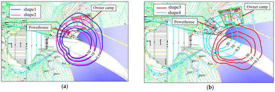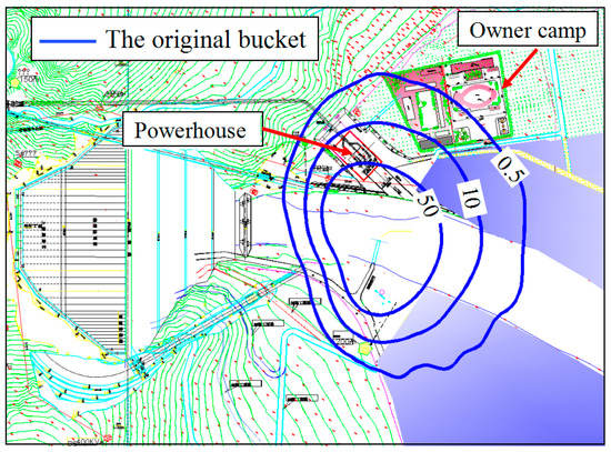 The improved mathematical model was used to calculate the rainfall intensity distribution of different buckets under the designed condition. As shown in Figure 9, the powerhouse was in the rainstorm area when adopting shape 1 (60°), shape 2 (50°), and shape 4 (50°), so the rainfall intensity around the powerhouse was not reduced by adjusting the angle of the flip bucket, the lateral diffusion degree of water jet, or the width of the impinging edge. However, for the shape 3, due to the effect of the curved surface attached to the left wall, the water jet and the peak value of the nappe wind turned away from the powerhouse, and the powerhouse and owner camp were no longer in the rainstorm area. This shows that the shape 3 is the best type to reduce the rainfall intensity around the powerhouse among the four bucket types.