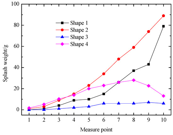 Under the action of nappe wind, the atomization rainfall around the powerhouse is greatly affected by the splash weight at the bottom of the left slope near the powerhouse tailrace. The splash weights of different bucket types were measured by the sponge collection boxes under the designed condition. As shown in Figure 10, for the weight of the splash water from measuring points 1 to 10, the splash weight has a decreasing trend. The splash weight of shape 2 is generally larger than that of other buckets. This is mainly because shape 1 and shape 2 are tongue-shaped buckets which makes the width of the impinging edge and the range of splashing droplets obviously larger than those of shape 3 and shape 4, so the splash weights of shape 1 and shape 2 are obviously larger than those of other buckets. Comparing shape 1 with shape 2, the bucket angle of shape 2 is smaller than that of shape 1, which causes the trajectory length of shape 2 to be relatively larger, and the distance between the measuring point and the impact point of jet has a great influence on the splash weight. Therefore, the splash weight of shape 2 is significantly larger than that of shape 1. Shape 3 and shape 4 have the same bucket angle but are affected by the action of the skew bucket. The splash weight of shape 3 is obviously smaller than that of shape 4. Therefore, shape 3 is more advantageous for reducing the weight of the splash water at the bottom of the left slope near the powerhouse tailrace.