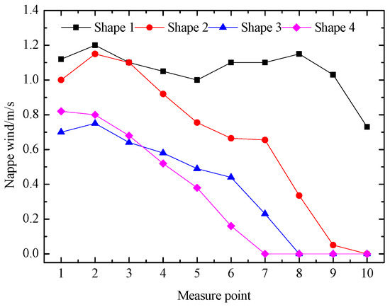 The nappe wind on the upstream left slope of the tailrace has a great influence on the rainfall intensity around the powerhouse, so we used the ultrasonic wind sensor to measure the nappe wind. We set 10 control points, numbered 1–10, to measure the nappe wind on the upstream left slope of the tailrace. We regarded point A as the first point, and the interval of the measuring length was 44 cm. The locations of the other points are shown in Figure 1. The distribution of nappe wind on the left slope is shown in Figure 11, the nappe wind of all the buckets tended to decrease from point 1 to point 10, and the nappe wind of the shape 1 attenuated much slower than the others. The main reason for this is that the asymmetry tongue-type and its larger bucket angle lead to the height of the trajectory nappe and the width of the impinging outer edge being relatively larger, which makes the trajectory nappe have a wide range of action, so the nappe wind of shape 1 attenuates much more slowly than the others. The nappe wind of shape 3 and shape 4 attenuate rapidly, which is mainly because the trajectory nappe of shape 3 and shape 4 are more contracted, and the impinging outer edges of shape 3 and shape 4 are obviously smaller than those of shape 1 and shape 2, which makes the action range of the trajectory nappe relatively small, so the nappe wind of shape 3 and shape 4 attenuate more rapidly than those of shape 1 and shape 2. The nappe wind around the powerhouse of the shape 3 is much less than that of the shape 4. In addition, since the scour hole of shape 4 is very deep so the sedimentation of the downstream river bed blocks the tailrace outlet completely, which impacts on the power generation seriously. We found that the shape 3 works best to reduce the nappe wind.