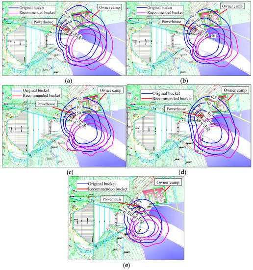 To compare the rainfall intensity distribution of the recommended bucket with that of the original bucket under different working conditions, the optimized mathematical model was used to calculate the rainfall intensity distribution, and the numerical results are shown in Figure 12. The intensity and coverage area of the rainfall reduced as the discharge decreased. The rainfall coverage area of the recommended bucket shifted to the right side of the spillway axis. This is mainly because the impact point and the peak value of the nappe wind turned to the right side of the spillway axis. The rainfall intensity around the powerhouse is significantly reduced when we adopted the recommended bucket, and the powerhouse was no longer in the rainstorm area under different working conditions.