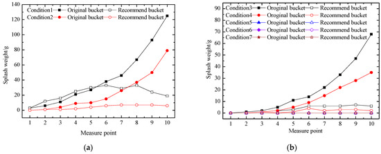 Splash weight at the bottom of the left slope of the physical model test: (a) represents the splash weight of condition 1 to condition 2; (b) represents the splash weight of condition 3 to condition 7.