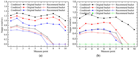 The nappe wind of the original bucket and the recommended bucket on the upstream slope of the powerhouse under seven conditions are shown in Figure 14. The nappe wind of the recommended bucket was also obviously smaller than that of the original bucket. The recommended bucket obviously suppressed the nappe wind on the left slope near the powerhouse. We found that the nappe wind of the original bucket attenuated slowly. This is mainly because the height and lateral diffusion of the trajectory nappe is large, which makes it act widely. However, for the recommended bucket, the width of the impinging outer edge and lateral diffusion of the trajectory nappe reduced which was affected by the bucket type.