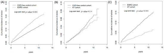 Cumulative incidence curves of stroke in the ESRD and KT groups compared with the CKD-free control group. Cumulative incidence curves of stroke in the ESRD compared with the CKD-free control group (A), KT groups compared with the CKD-free control group (B), KT groups compared with the ESRD groups (C).
