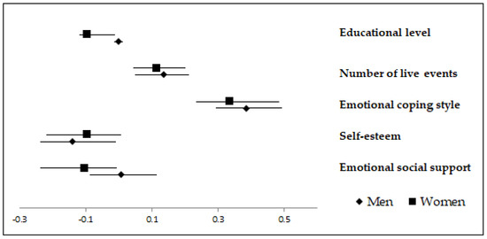 Beta values in model 4 showed that emotional coping style was the variable most associated with psychological distress for both genders, as men and women with greater emotional coping style reported greater psychological distress. In the men group self-esteem and the number of life events experienced during the last year were also significant predictors of psychological distress, so men with lower self-esteem and those who had gone through a larger number of life events during the last year reported greater distress. In the women group other significant predictors of psychological distress were the number of life events experienced during the last year, emotional social support, and educational level; thus, women who presented greater distress had experienced a higher number of events, counted on less emotional social support, and had a lower educational level. Figure 1 shows the Beta values for men and women obtained in the final regression model, which includes all IVs in the equation predicting the logarithm of psychological distress. This figure only includes the variables whose Beta values were statistically significant in women and/or men.