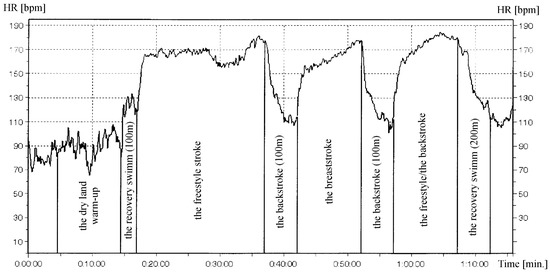 One of the heart rate (HR) profiles and structure of one of the single sessions during 12-week swimming training.