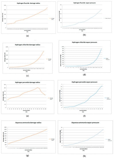 Comparison of damage radius and vapor pressure for each chemical substance studied. In each graph, the horizontal axis represents the concentration (%) range of the substance, and the vertical axis represents the damage radius (m) and vapor pressure (mmHg): (a) Hydrogen fluoride damage radius; (b) Hydrogen fluoride vapor pressure; (c) Hydrogen chloride damage radius; (d) Hydrogen chloride vapor pressure; (e) Hydrogen peroxide damage radius; (f) Hydrogen peroxide vapor pressure; (g) Aqueous ammonia damage radius; (h) Aqueous ammonia vapor pressure.