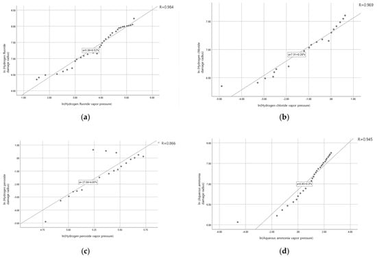 Correlation between damage radius and vapor pressure for each substance studied: (a) Hydrogen fluoride; (b) Hydrogen chloride; (c) Hydrogen peroxide; (d) Aqueous ammonia.