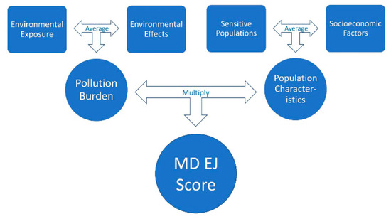Overview of MD EJ (Maryland Environmental Justice) Scoring Process. The Environmental Exposure and the Environmental Effects Scores are averaged to calculate the Pollution Burden, and the Sensitive Populations and Socioeconomic Factors are averaged to create the Population Characteristics Score. The Pollution Burden and Population Characteristics are then multiplied to calculate the final MD EJ Score.