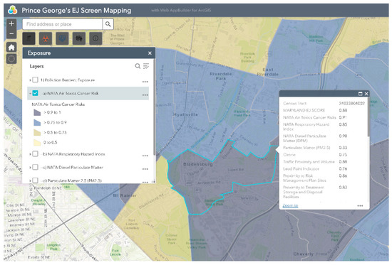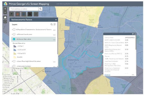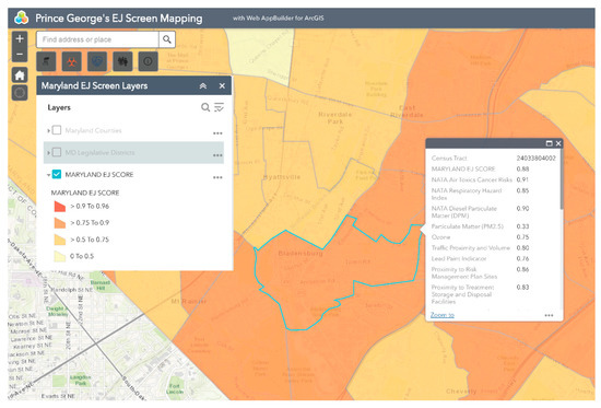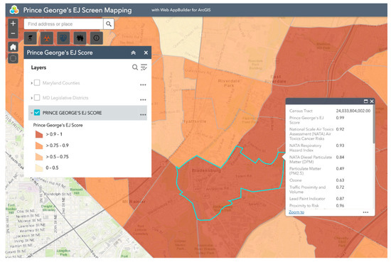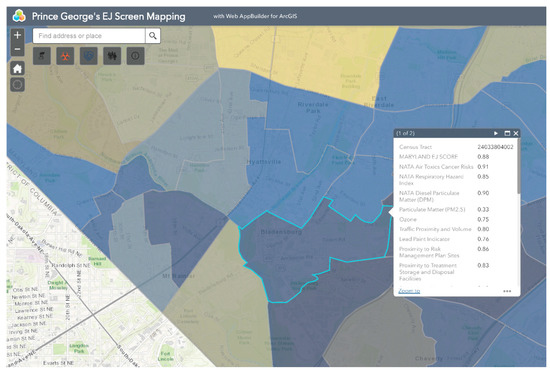 Bladensburg is a town in Prince George’s County that has experienced environmental injustice due to racial and economic stratification. The Bladensburg population is primarily Black (62.7%) and Latinx (33.0%), with small concentrations of White (13.9%) and Asian (1.6%) residents [66]. Studies have shown that proximity to hazards is directly related to race/ethnicity, with one study specific to Maryland, Louisiana, and West Virginia finding that African-Americans are more likely to be located in close proximity to Toxic Release Inventory (TRI) facilities [67,68,69,70,71]. In comparison to the national average of 14%, 20.1% of Bladensburg residents live below the federal poverty line [66]. Due to underlying social and economic vulnerabilities, residents in Bladensburg are more likely to experience low property values and the disproportionate siting of environmental hazards in their communities than their more affluent counterparts [72,73]. Bladensburg residents also endure a large pollution burden, with heavy commuter and industrial traffic and a concrete block plant acting as sources of particulate matter (PM), volatile organic compounds (VOCs), and polycyclic aromatic hydrocarbons (PAHs) [74]. Due to their exposure to air pollutants, Bladensburg residents are at increased risk for respiratory problems and cancer [72,75,76,77]. An example analysis of environmental injustice in Bladensburg using MD EJSCREEN is presented below (Figure 2, Figure 3, Figure 4, Figure 5 and Figure 6). For the purpose of the Bladensburg case study, the PG EJ score, a separate score created by the tool, is used, in addition to the MD EJ score (Figure 2). The PG EJ score compares the Bladensburg census tract to the rest the census tracts in Prince George’s County, while the MD EJ score compares the Bladensburg census tract to all census tracts in Maryland. A comparison with EPA EJSCREEN is provided for Bladensburg in Figure 7.