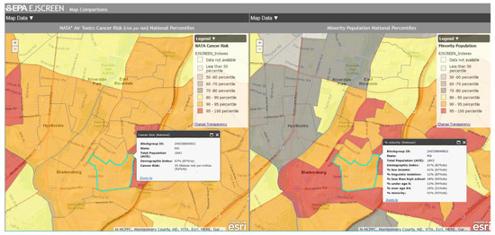 The US EPA has set environmental health standards, yet, these programs have not specifically confronted the issue of cumulative impacts on non-White populations [81]. This makes mapping tools such as EJSCREEN, CalEnviroScreen, and MD EJSCREEN significant in determining how populations of color suffer an unjust burden of environmental risks. The scores available in MD EJSCREEN allow residents and other stakeholders to compare the rates of pollution, the effects of pollution, and the most vulnerable subpopulations to other areas of the state. For instance, users can easily visualize that areas with a higher percentage of low-income residents also tend to be located near areas with high traffic volume and PM2.5, as well as the potential health risks associated with those locations [81]. These scores can be used by residents to better advocate for their health, and government officials to determine specific changes that need be made to reduce environmental injustice.