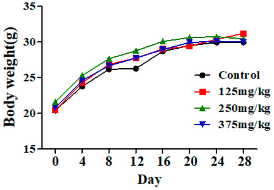 Effect of DEHP exposure on the body weight of mice (n = 10). The result showed that the body weight of mice in the control group and DEHP-exposed groups exhibited no significant changes. Data represented as means.