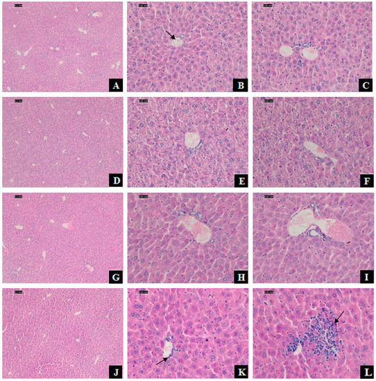 Effect of DEHP exposure on histopathology of mice liver. Photomicrographs of sections stained with hematoxylin-eosin (H&E) from mice liver tissue. Scale bar was 0.2 and 0.5 mm. (A–C): Hepatic cross-sections from the control group (treated with corn oil), with the normal hepatic lobules and cell structure, the cells radially arranged around the central vein (B: arrowhead) to form the hepatic cord; (D–F): Hepatic cross-sections from 125 mg/kg DEHP group; (G–I): Hepatic cross-sections from 250 mg/kg DEHP group; (J–L): Hepatic cross-sections from 375 mg/kg DEHP group with a small agglomeration of leukocytes in the venule (K: arrowhead) and inflammatory cells infiltration (L: arrowhead).