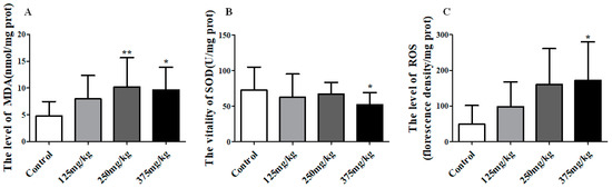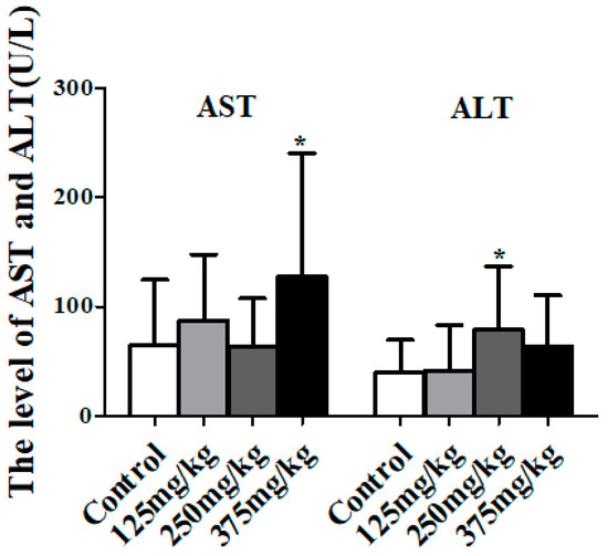 As Figure 3 shows, the activity of AST in mice serum of the 375 mg/kg DEHP treatment group had a significant increase compared to the control group (p < 0.05). Additionally, compared to the control group, the activity of ALT in mice serum significantly increased to 78.61 U/L in the 250 mg/kg DEHP treatment group (p < 0.05).