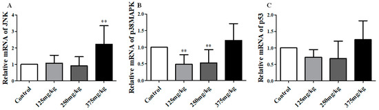 We detected the mRNA and protein/phosphoprotein expression of JNK, p38MAPK and p53 in mice’s liver, and found the results as below. The mRNA analysis results are showed in Figure 5. In the 375 mg/kg DEHP-exposed group, the level of JNK mRNA was higher than the control group, about 1.2 (p < 0.01), and no significant changes were found in other groups (Figure 5A). On the contrary, the expression of p38 mRNA was markedly decreased in the 125 and 250 mg/kg DEHP-exposed group compared to the control group (p < 0.01) (Figure 5B). However, there were no significant changes in p53 mRNA.