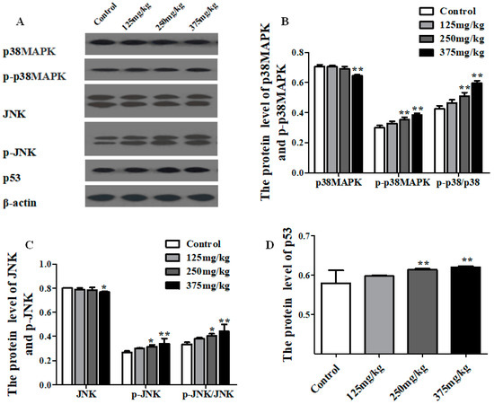 The protein expressions of the JNK, p-JNK, p38MAPK, p-p38MAPK, and p53 are shown in Figure 6. Compared with the control group, the level of p38MAPK protein showed a dramatic increase in 375 mg/kg DEHP treatment group (p < 0.01), and the level of p-p38MAPK protein was on the rise at the higher level of dose, especially in 250 and 375 mg/kg DEHP treatment groups, which had a statistical difference (p < 0.01). In addition, the ratio of p-p38MAPK to p38MAPK markedly risen in the 250 and 375 mg/kg DEHP treatment groups (p < 0.01) (Figure 6B), and the same trend was also found in the results of JNK and p-JNK (Figure 6C). As shown in Figure 6D, the expression of p53 protein remarkably increased, particularly in 250 and 375 mg/kg DEHP-exposed groups (p < 0.01).