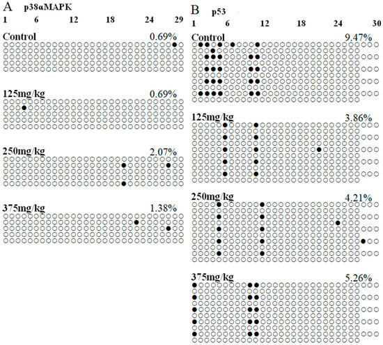 Bisulfite sequencing and PCR-based single molecule sequencing analysis were performed. Each row represents an individually sequenced clone, and each circle represents a CpG residue. White and black circles indicate non-methylated and methylated cytosines, respectively. In each group, five positive clones were randomly collected for DNA sequencing analysis. A: p38ɑMAPK gene, B: p53 gene.
