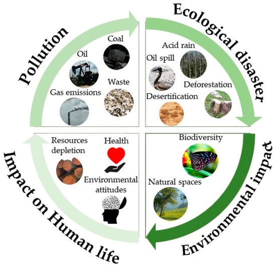 Some of the ecological disasters caused by humans (the Chernobyl nuclear disaster, the desertification of the Aral Sea, the oil spills in the Niger Delta, the Fukushima nuclear disaster, the toxic cloud over Seveso, the oil spills in the Gulf of Mexico, the Prestige oil spill), have led to catastrophic consequences for the environment, and for human, plant and animal life, even accelerating deforestation and the loss of diversity in some cases. On the other hand, the use of fossil fuels (coal and crude oil), together with toxic gas emissions into the atmosphere have played a negative role in the increase of the Earth’s temperatures []. Hence, it is necessary to reduce toxic emissions and leave fuels like coal behind and start using renewable energies [].