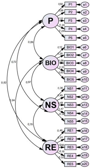 The determination of SEM is a graphic representation of the correlations between subscales. Therefore, the values obtained in covariance and (R) correlation indicate the positive interdependence among the different subscales (Table 4). In this sense, the higher the value in each subscale’s environmental attitude, the higher the value obtained in the remaining ones. Moreover, the positive correlation between P <—> BIO (R = 0.89), BIO <—> NS (R = 0.97), NS <—> RE (R = 0.78), P <—> NS (R = 0.72), BIO <—> RE (R = 0.84), and P <—> RE (R = 0.82) is gathered.