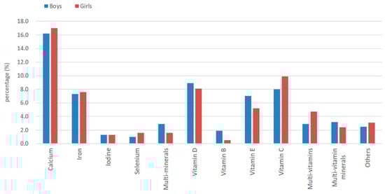 Figure 1 shows that the most frequently used supplements were calcium (16.7%), vitamin C (9.2%), vitamin D (8.5%), iron (7.5%), and vitamin E (6.0%). Among the mineral dietary supplements, calcium is the most common supplement, used by 16.7% of children, followed by iron (7.5%). Among the vitamin dietary supplements, vitamin C is the most used (9.1%), and vitamin D is the second most used (8.5%). Nearly one-third of the children taking calcium supplements were also taking vitamin D. Only 1.1% of primary school students used vitamin B supplements. The percentage of use for multi-minerals, multi-vitamins, multi-vitamin minerals, and other dietary supplements was 2.2%, 3.9%, 2.7%, and 2.9%, respectively. There were no significant differences in supplement types used between boys and girls.
