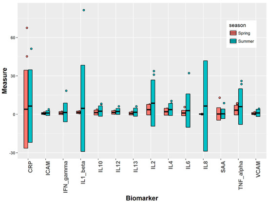 Figure 1 shows the summary statistics of biomarker results in the spring and summer seasons of 2014. For each biomarker, outliers were identified by falling outside three standard deviations of the means for spring and summer separately. The means and standard deviations were calculated by assigning equal weights to each data entry (an individual could have multiple data entries if they consented to provide blood samples at multiple days of the week). These outliers were hence removed and the resultant data were used for all subsequent analysis. As a result, no data were removed for IL-1β and IL-12; <1% of data were removed for IFN-γ, IL-2, IL-4, IL-6, IL-13, TNF-α, and ICAM-1; <2% of data were removed for IL-8, and IL-10; 4% data were removed for VCAM-1; 5% of data were removed for SAA, and 6% of data were removed for CRP.