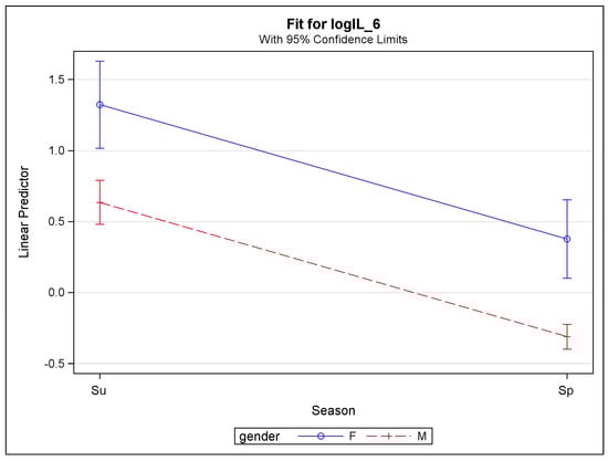 Predicted log (IL-6) concentration (with confidence intervals) versus season (Su: summer; Sp: spring) and gender (F: female; M: male).