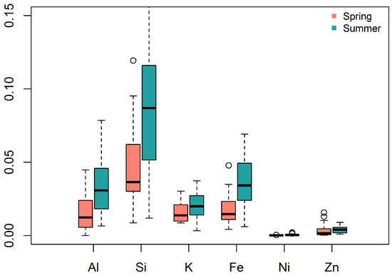 Since the PM2.5 concentration did not exhibit a significant effect on more than half of the biomarkers from the linear mixed models, we considered to further investigate the PM2.5 chemical composition (elemental concentrations) and their relations with season on biomarkers. The results were plotted in Figure 3. It can be seen that the contributions of six elements—aluminum (Al), silica (Si), potassium (K), iron (Fe), nickel (Ni), and zinc (Zn)—were enhanced in summer than in spring. This showed that the variation among biomarker levels may be related to particulate composition more than the total particulate mass alone. Some of these elements such as Fe, Ni, and Zn are also related with traffic emissions [51], suggesting also the changes in traffic patterns in two seasons. However, there was no significant difference in BC concentrations between two seasons. Due to a large amount of missing values in element contributions, they were not included as explanatory variables in the linear mixed models of this study, but they could be valuable factors for biomarkers to be investigated in future studies. Besides these six elements, other elements were also measured on collected filters by X-ray fluorescence spectroscopy, but they were not enhanced during summer than during spring [40].