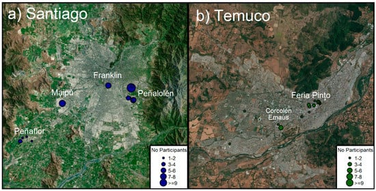Study site: (a) map of Santiago; (b) map of Temuco.