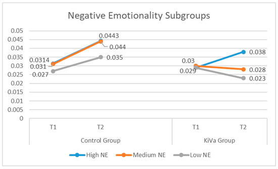 Significant interactions (group by time) were found in the low-NE (B = −0.016; SE = 0.007; p = 0.030) and medium-NE (B = −0.016; SE = 0.006; p = 0.010) subgroups, but not in the high-NE subgroup (B = 0.006; SE = 0.006; p = 0.379). This means that the treatment had an effect, compared to the control group, only in the low- and medium-NE subgroups. As we can see from Table 3 and Figure 2, the highest effect size was found for the low-NE subgroup, where the KiVa group showed a decreasing trend over time and the control group showed an increase over time. The same trend was found in the medium group, although with a smaller effect. Within the high-NE subgroup, the effect size comparing the trend across time of the experimental and control groups was very small, because, in both groups, these early adolescents considerably increased their level of bullying.