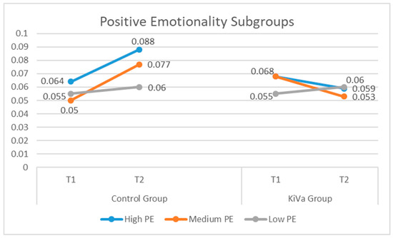 Significant interactions (group by time) were found in the high-PE (B = −0.032; SE = 0.011; p = 0.007) and medium-PE (B = −0.042; SE = 0.009; p = 0.000) subgroups, but not in the low-PE subgroup (B = −0.000; SE = 0.012; p = 0.977). This means that the treatment had an effect, compared to the control group, only in the high- and medium-PE subgroups. As we can see from Table 3 and Figure 3, the highest effect was found for the medium-PE and the high-PE subgroups, where the KiVa group showed a decreasing trend over time and the control group showed an increase over time. The effect size within the low-PE subgroup was close to 0, because, in both experimental and control groups, these young adolescents increased their level of victimization.
