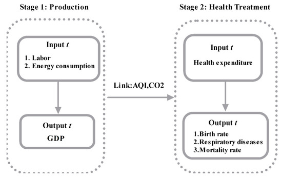 The main contribution of this paper is that the economic, environmental, and health efficiencies are jointly analyzed, which avoids under- or overestimation. Data from 31 Chinese cities from 2013–2016 were examined in two stages: a production stage and a health stage. In the production stage, labor, fixed assets, and energy consumption were the input indicators Gross Domestic Product (GDP) as output indicator, linkage and health stage variable are CO2 and Air Quality Index (AQI). In health stage the health expenditure is input indicator; the output indicators are birth rate, respiratory system and mortality rate.