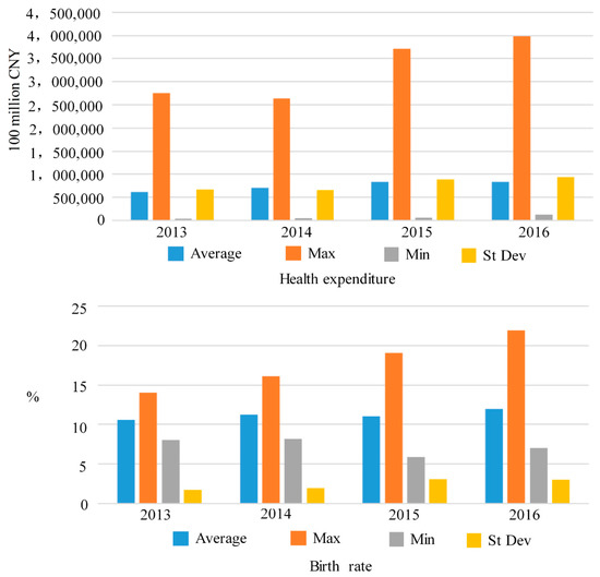 Figure 4 shows the health expenditure indicators and birth rate indicators from 2013 to 2016. As can be seen the government health expenditure input maximum value increased significantly in 2014 and 2015. There was also a large increase in the minimum value, especially in 2016 when the government increased investment.