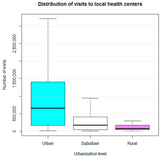Descriptive statistics were calculated. Additionally, box-and-whisker plots were constructed to display the distribution of the number of visitors for the LHC websites according to urbanization levels.