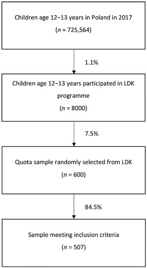 The second stage of recruitment of the study group involved a random selection of participants in the Athletics for All program from each school (n = 600). The proportion of boys and girls selected was required to be in accordance with the general proportion of participants of the Athletics for All program (with a higher share of girls) (random sampling). Afterwards, the individuals meeting the inclusion criteria (Figure 1) were pair-matched with the control ones.