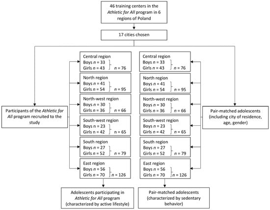 The second stage of recruitment of the control group involved a random selection of adolescents who were neither participants in the Athletics for All program nor participants of any other physical activity program. The pair-matching procedure was applied, and the variables used for matching included gender, age, and city of residence. During this stage, the individuals eligible for recruitment, after being pair-matched with study individuals, were first identified, and then for each study individual, one pair-matched control individual was randomly chosen (pair-matched random sampling).