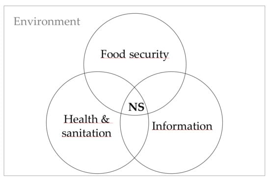 Nutrition security is a framework based on community studies aimed to identify the determinants of nutrition [21,22]. It assumes stable access to sufficient innocuous and nutritious food (i.e., food security), health care and sanitation, and information that in conjunction allow self-care-oriented behavior for health protection (Figure 1). It serves as an assessment guide that goes beyond the individual level extending to structural (physical and socioeconomic) factors. In 2013, FAO enlisted 30 indicators of food and health supplies that are interrelated with nutritional processes and outcomes [23] (p. 16). These cover broad contextual factors including availability, accessibility, affordability and stability of food, which are key concepts in food environment frameworks [14,15,24,25].