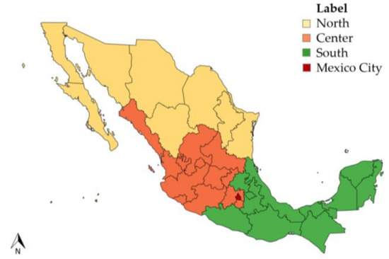 Furthermore, there are regional differences in nutrition and dietary patterns across the country. In northern states (Baja California Norte, Baja California Sur, Chihuahua, Coahuila, Durango, Nuevo León, Sonora, Tamaulipas) the highest prevalence of obesity in adults (37.8%) is reported compared to central (29.4%) and southern (34.7%) regions [32] (Figure 2). The highest energy intakes of sugar-sweetened beverages and animal products and the lowest intakes of fruits and vegetables are also reported in northern states [32,35]. In contrast, some southern states experience high social marginalization and distinct nutritional outcomes (stunting) [31].