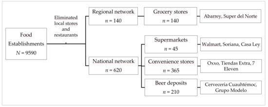 Figure 3 showed the categories of food establishments included for analysis. The selection of grocery stores, supermarkets, convenience stores and beer deposits, from a database that included restaurants, corner stores, specialty stores, informal food stands, and other types of economic units registered in INEGI DENUE, was based on two criteria that facilitated the identification of establishments belonging to large commercial networks, namely business name and class of economic activity.