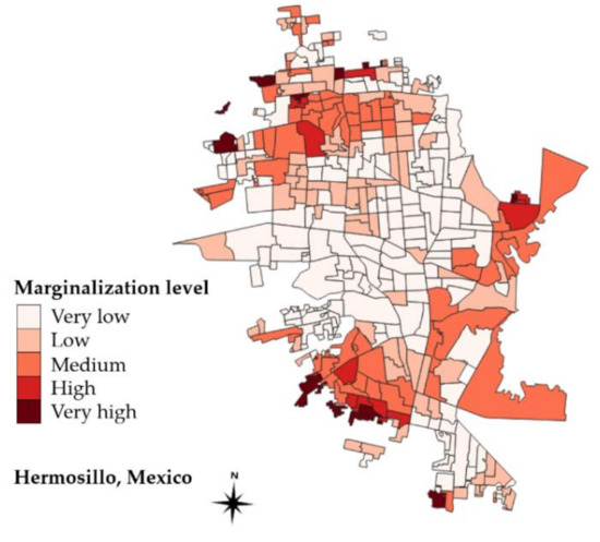 Basic geo-statistical areas by social marginalization level in Hermosillo City (n = 410 AGEB).
