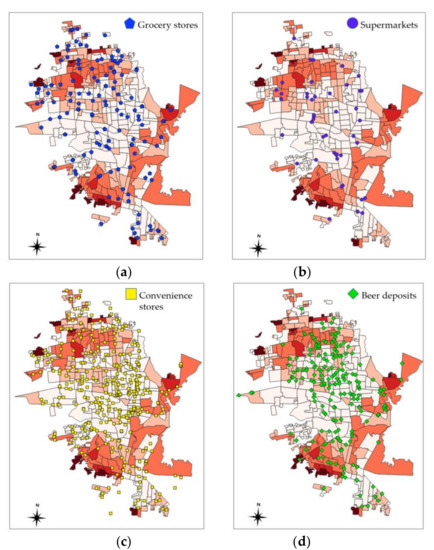 Spatial distribution of food establishments in Hermosillo (n = 760): (a) grocery stores, (b) supermarkets, (c) convenience stores, and (d) beer deposits.